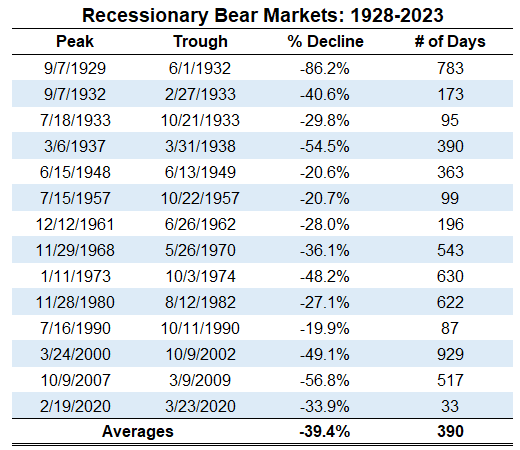 As the following table shows, there have been 14 prior instances of recessionary bear markets in the U.S. going back to 1929. We can see that these bear markets tend to be more severe with an average decline in the S&P 500 of 39.4%. They also tend to be more prolonged, with the length of time spent in the bear market lasting an average of 390 days. Recessionary bear markets are also often associated with extremely difficult economic situations. Some examples of these are the Great Depression, the 2008-9 Global Financial Crisis, and most recently, the Covid-19 Pandemic.