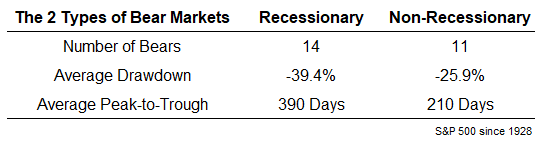 The last table below summarizes the differences between these two types of bear markets with regards to number of occurrences, average drawdown, and average days peak-to-trough.
