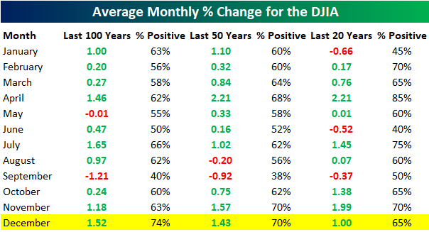 Finally, the last chart pivots away from the S&P 500 and focuses instead on the Dow Jones Industrial Average (US blue chip large-cap index). The chart shows that December has been a strong month for the Dow, posting average returns of 1.52%, 1.43% and 1% over the last 100, 50 and 20 years, with positive returns 74%, 70% and 65% of the time, respectively.