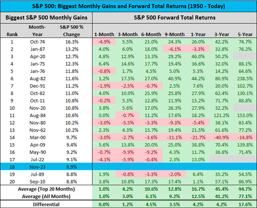 The S&P 500 snapped a three-month losing streak in November, rising 8.9% and posting the best months of returns since July 2022. The following chart shows that November 2023 was the 18th best monthly return for the S&P 500 Index since 1950. It also highlights how these strong monthly performances have typically been followed by strong forward returns as shown by the average performances for these top performing months compared to the all-month average. In the very short-term of one to three months, the performance offers minor differences, but when we shift to a longer-term view, we can see a significant outperformance. The 1-, 3-, and 5-year forward periods averaged returns of 16.7%, 45.4%, and 94.7% respectively which is a +4.2%, +4.2%, and +17.6% differential over all-month averages.