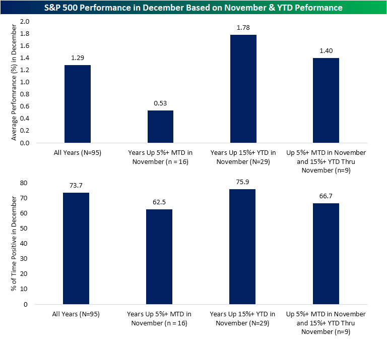 With strong momentum from November carrying into December, let’s look at how this has specifically affected the last month of the year historically. The next chart observes the performance of the S&P 500 in December based on varying past performance levels for the month of November and year-to-date (YTD). As the chart illustrates, the average return for the month of December since 1928 has been 1.29% with positive returns 73.7% of the time (December is typically one of the stronger months). When we observe different November performances, we can see how this momentum has tended to carry through to the end of the year. Historically, the S&P 500 has averaged less impressive returns of 0.53% in December with positive returns 63% of the time when November was up at least 5%. However, in years when the S&P 500 was up 15% or more YTD like this year, independent of November’s performance, it resulted in average December returns of 1.78% and positive returns 75.9% of the time which is very impressive. Finally, years like this year with both a 5%+ gain in November and a 15%+ YTD gain through the end of November have likewise averaged a stronger-than-normal 1.4% gain with positive performance two-thirds of the time. It is important to note the number of occurrences in each of these scenarios can have an effect on average returns (as represented by the bracketed ‘N’ number). For example, years when the S&P 500 was up 15%+ YTD occurred 29 times in history vs. only nine prior occurrences where there were both a 5%+ gain in November and a 15%+ YTD gain through the end of November.
