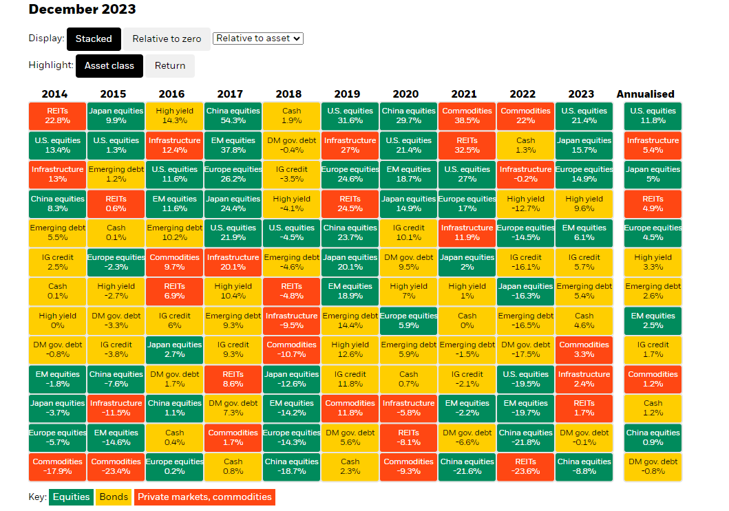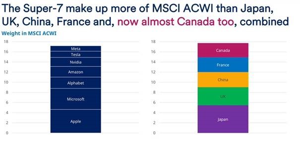 Finally, the first chart below shows the performance of different asset classes globally as of December 1, 2023, and for the past decade. The chart separates data by year and asset class for each of the past 10 years and also provides annualized rates of return over that period. As we can see, U.S. equities were the standout this past year, mostly propelled by the rise in technology and AI-related stocks. The second chart, which we found interesting, reinforces the tech-heavy U.S. stock performance when we observe that as of November 30, 2023, the “Super-7” (the large-cap tech heavy group of Meta, Tesla, Nvidia, Amazon, Alphabet, Microsoft, and Apple) now make up almost as much of the MSCI All-Country World Index (which tracks nearly 3,000 stocks in 48 countries) than Japan, UK, China, France, and Canada combined.