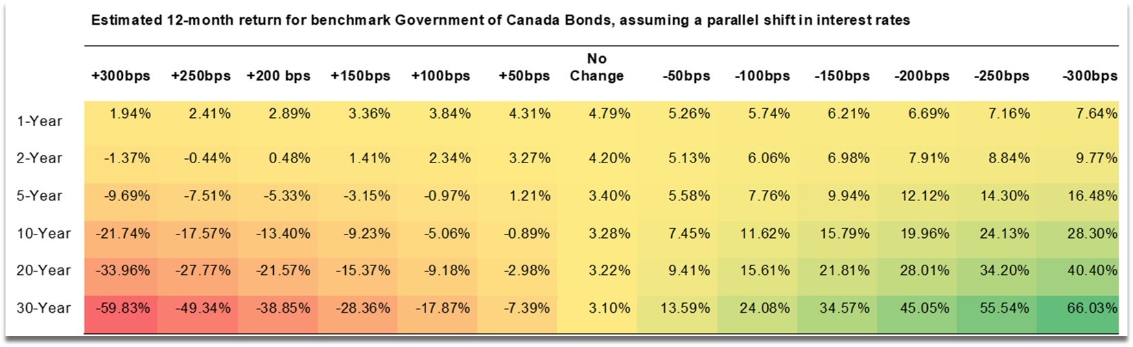 Falling Rates also represent an opportunity for fixed income holdings. The table below shows the effects of interest rate movements on current Government of Canada Bonds. It is important to note that the table highlights the potential total return for bonds in various interest rate scenarios on an estimated 12-month timeframe. As we can see, any fall in interest rates represents strong value for existing bonds.
