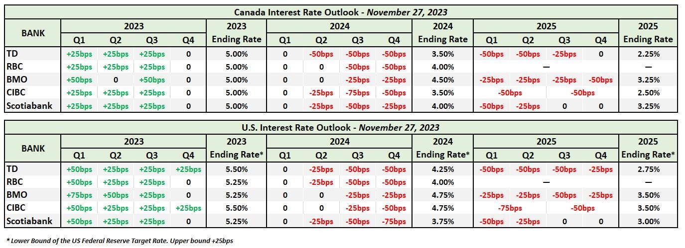 As we wrap up the week, and with only two weeks remaining in the year, we wanted to take this time to review some major rate decisions, forward rate projections, and some year-end performance data. Last week, the Bank of Canada left rates unchanged for the third consecutive meeting. This week, the U.S. Federal Reserve also announced that they were leaving rates unchanged, for the third consecutive meeting. Both rate decisions came as little surprise to economists based on current sentiment and inflation data. The table below shows Canada’s big five banks’ projections for both the Canadian and U.S. Interest Rate outlooks for 2024 and 2025. Although the timing and extent of rate changes differs between institutions, all five banks are projecting rates will begin to fall next year with many pointing to a decrease starting Q2 2024 for both the U.S. and Canada.