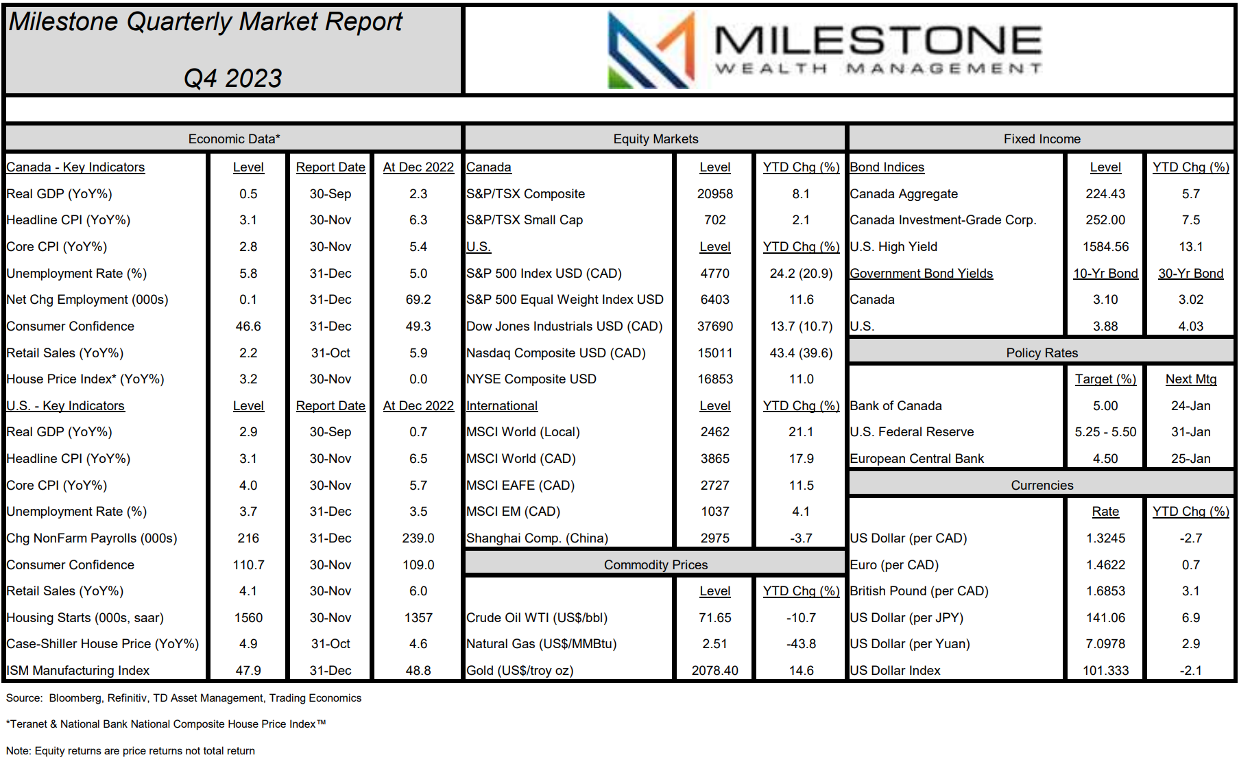 Here is our Quarterly Market Report on economic data, capital markets, commodities, and currencies through December 31st, 2023: