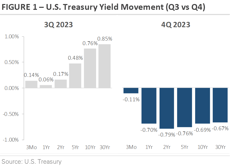 Following a significant increase in Q3, Treasury yields moved sharply lower in Q4. Figure 1, which compares the change in yields during the two quarters, graphs the opposing interest rate moves. The gray bars show yields increased in Q3, with longer maturity yields rising the most. In contrast, the navy bars show yields reversed sharply in Q4, erasing nearly all their Q3 rise. The abrupt reversal can be attributed to a significant change in the market’s view heading into 2024.