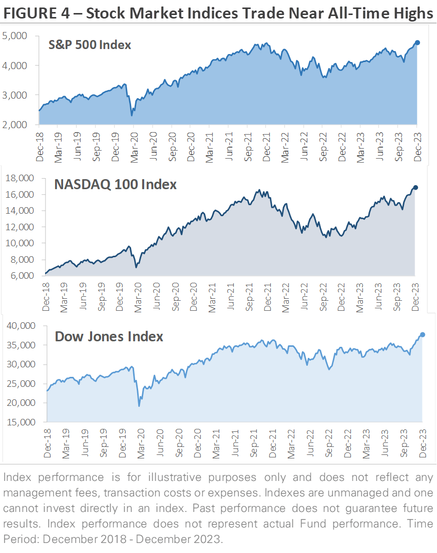 What does the financial landscape look like today? Following the Q4 rally, multiple major stock market indices are trading near all-time highs. Figure 4 on the next page graphs the prices of three broad stock market indices: the S&P 500, the NASDAQ 100, and the Dow Jones. The S&P 500 is hovering near its January 2022 all-time high (0.5% below), while the NASDAQ 100 and Dow Jones both made new all-time highs in December. On a year-to-date basis, the S&P 500 returned +26.3% including dividends in 2023, while the NYSE Composite returned +13.8%. The NASDAQ 100 soared +54.7%, its biggest year since 1999. In CAD terms, these returns are about 3% lower. Along the way, stocks defied higher interest rates, geopolitical tensions, and multiple U.S. regional bank failures to record solid gains.