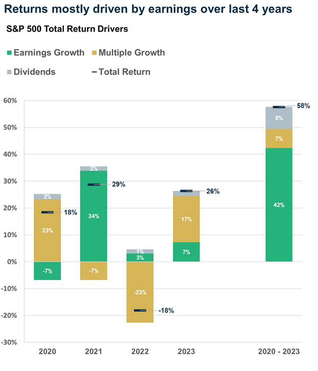 There has been a lot of talk about how stock P/E (Price/Earnings) multiple expansion has been the main driver of returns in the market; however, when we explore this week’s chart of the week, we can see that returns over the past four years have primarily been driven by earnings growth. There are three main factors when considering investment returns; these include earnings growth, multiple growth, and dividends. Earnings growth refers to the annual compound annual growth rate (CAGR) of corporate earnings. It is a key indicator of the health and profitability of a business after all expenses are paid. This is used in valuation models and is a key factor in determining a stock's intrinsic value. It is calculated by comparing the change in an entity's reported net income over a period, such as quarterly or yearly. A high level of earnings growth is generally considered favorable, indicating a healthy and profitable business. In contrast, multiple growth refers to the impact of a company's growth on its valuation multiple. Valuation multiples are used to compare companies and determine their relative value. They measure aspects of a company's financial well-being by comparing two metrics, price and earnings, by dividing one by the other to derive their P/E multiple. When a company's growth rate increases, it can lead to higher P/E valuation multiples, indicating that investors are willing to pay more for the company's future earnings. Lastly, dividends are payments made by a company to its shareholders as a distribution of profits. Companies that consistently grow their dividends over time also generally contribute to higher company valuations.