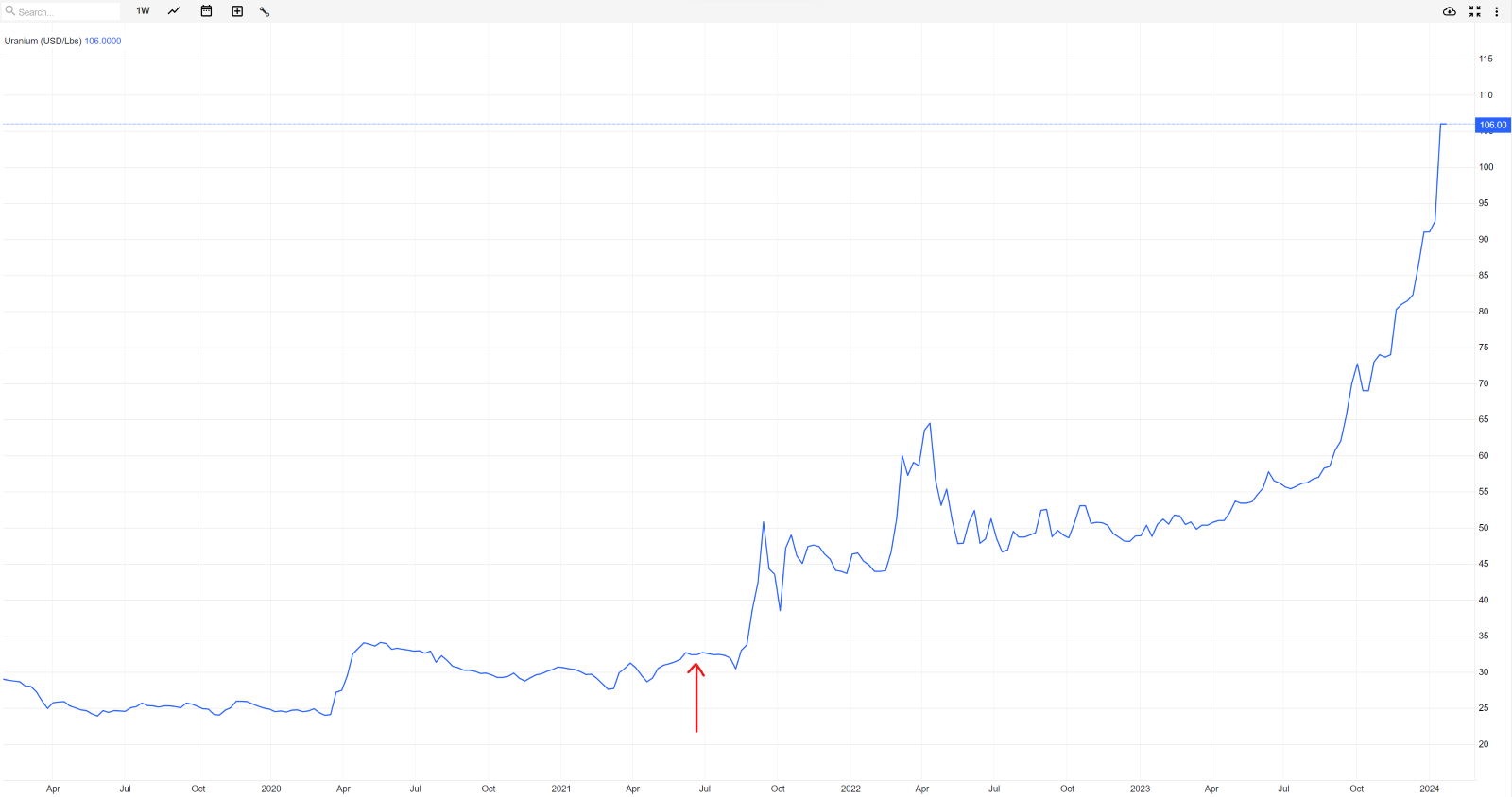The extreme rise in the price of uranium, especially in the past year where it has doubled, can be attributed to a combination of factors including resurgent demand, supply challenges, and geopolitical risks. The increased demand for nuclear power, particularly from major economies like China, India, Japan, Europe, and the United States, has led to the need for more uranium, when ‘enriched’ into U-235 concentrations, is used as fuel for large- and small-scale nuclear power plants. This demand is being driven by several factors, including the need for a reliable and low-carbon source of power, the increasing electrification of end-uses, and the growth in global energy demand due to population growth and industrial development. Additionally, nuclear power - especially via small nuclear reactors (SMEs) - is seen to reduce greenhouse gas emissions and address climate change concerns, as it provides a powerful, stable, and consistent source of electricity without emitting greenhouse gases during operation. Furthermore, nuclear energy can contribute to energy security for some countries by reducing the dependence on fossil fuel imports.