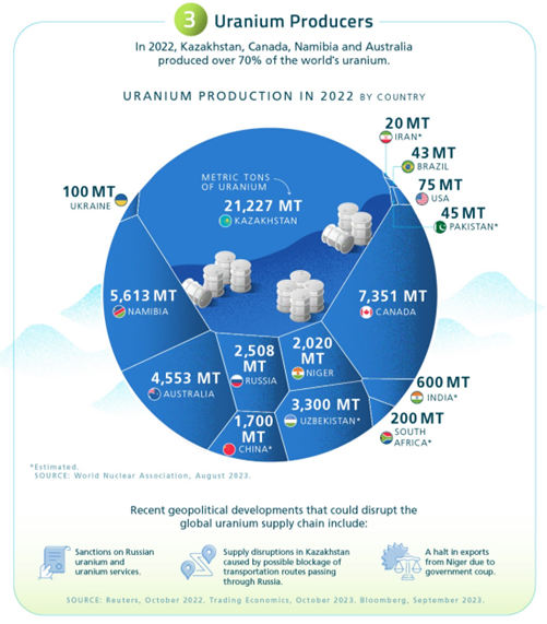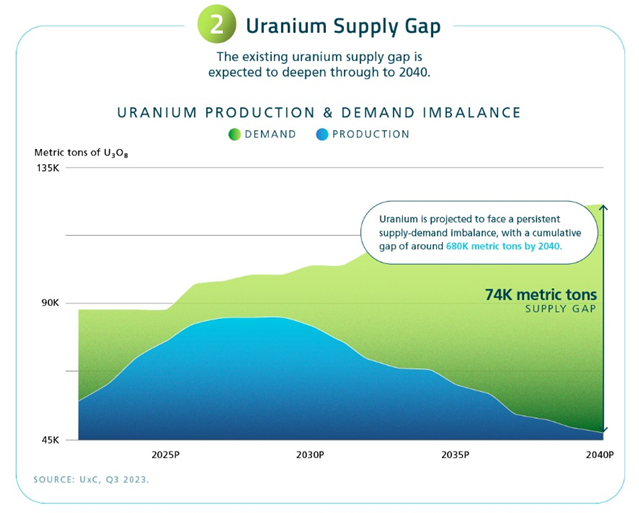 The following charts we wanted to highlight focus on the project supply gap that is expected to deepen through 2040. As we can see in the first chart, by 2040 the projected supply gap will be 74,000 metric tons of uranium with a cumulative gap of around 680,000 tons. The second chart below highlights the beneficial economic position of uranium-producing countries including Canada, which along with Kazakhstan, Namibia, and Australia, produced over 70% of the world’s uranium in 2022.