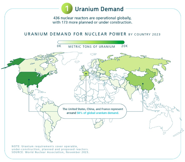 As the next chart illustrates, the demand for uranium has been dominated by China, the U.S., and France, representing 58% of the global uranium demand in 2023. This demand is only going to grow as there are currently 436 nuclear reactors operational globally with an additional 173 planned or under construction.