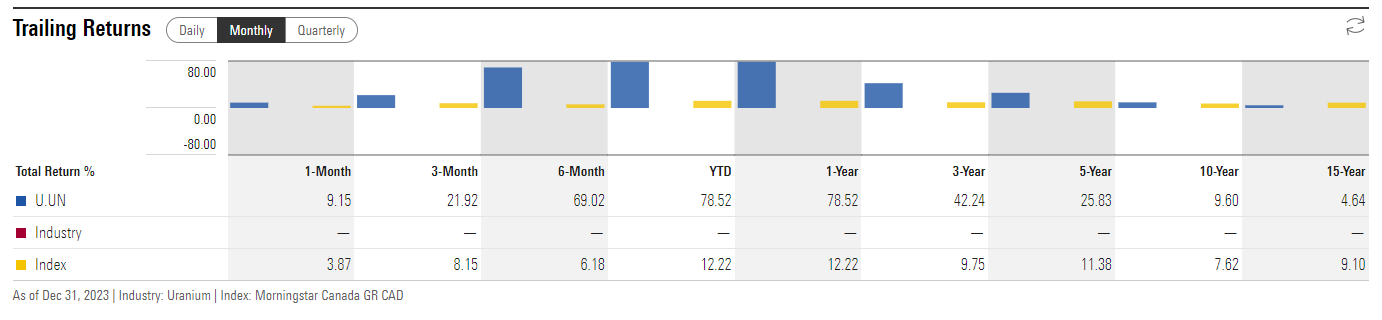Back in mid-2021 after some thorough research, Milestone recognized the supply shortfall and the increasing demand of uranium for future and ongoing nuclear energy projects, which led to our initial purchase of Sprott Physical Uranium Trust units (formerly Uranium Participation Corp). This investment is the only vehicle in North America where you can indirectly own physical uranium, another reason for our initial investment. The next chart shows the price of Uranium over the last five years (red arrow indicates where we first bought), and the table following that shows that the performance of the Sprott investment vehicle (in blue) has been very strong, with the 2023 calendar-year return being 78.5% and the 3-year annualized compound returns at 42.4%. Based on timing, our initial investment has produced a total return of close to 200% up to this point, after taking some profits in 2022.