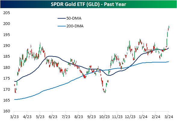 The price of gold has surged, having recently posted record prices, and closing today at USD$2,177.84. The recent rise has been driven by economic and geopolitical uncertainty, expectations of interest rate cuts, and a weaker U.S. dollar. For today’s charts of the week, we are going to observe the SPDR Gold ETF (GLD) which tracks the gold bullion market and provides insight to the overall price of gold. With the recent surge in gold prices, the ETF is up over 5% this month, reaching record highs and closing at an extremely overbought level compared to its 50-day moving average (DMA).