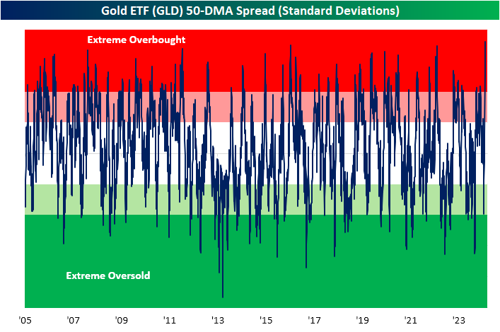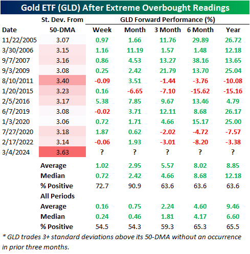 On Monday, the ETF closed 3.63 standard deviations above its 50-DMA, marking the most overbought level in its trading history, as seen the first chart below. Historically, such overbought readings have led to positive forward returns for GLD. Past instances where GLD closed at least 3 standard deviations above its 50-day without doing so in the prior three months have resulted in above-average returns from one week to six months later. Notably, and as seen in the second chart below, returns one month later have been particularly strong, averaging 2.95% compared to the all-periods average of 0.75% and with only a single decline observed after a similar instance in 2015. Returns three and six months out have also shown significant strength, averaging 5.57% and 8.02% respectively compared to all-period averages of 2.24% and 4.60%, respectively. Looking ahead one year later, performance tends to be around average.