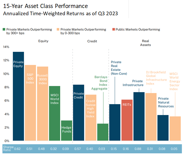 Moving to longer terms, the last chart below illustrates the performance of different private assets over the past 15 years considering annualized time-weighted return as of Q3 2023. As we can see, private markets significantly outperformed public markets with the only exception coming from public vs. private real estate investment trusts (REITs). It also notes the Sharpe Ratio for each market, which is a well-known financial metric that measures the performance of a security or portfolio relative to the risk-free rate (excess return), after adjusting for its risk (volatility). As we can see, the Sharpe Ratio is higher for each of the private assets compared to public, again except public REITs vs. private non-core real estate, indicating overall better returns for the level of risk.