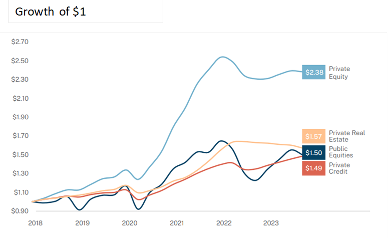 With such a high allocation by endowments, pension funds, and family offices, it is no surprise that the performance for private assets has been impressive compared to public equity. The next chart highlights $1 growth in the three primary categories of private assets (equity, real estate and credit) and the performance of public equities. As we can see, since 2018, private equities have significantly outperformed public equities. Also, we can observe private real estate outperforming public equities by a small margin and even private credit only slightly underperforming public equities. It is also important to note that each of the private asset areas were subject to much lower volatility and drawdowns.