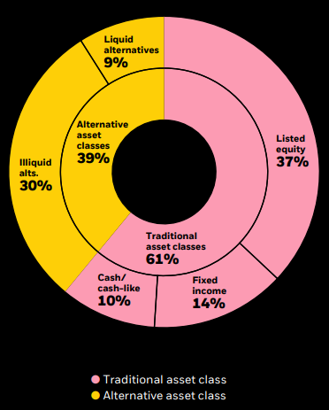 These markets often involve longer investment time horizons, allowing investors to participate in the growth of private companies over time. This long-term approach can result in significant capital appreciation and wealth accumulation. One need look no further than some of the best performing endowment funds in the world like the Yale Endowment Fund (less than 5% in domestic equities), or the Canada Pension Plan (under 25% in public equities), or even the composition of high and ultra-high net worth investors. According to the 2022-23 Blackrock Global Family Office Report, here is the average asset allocation of the correspondents of their latest survey. As you can see, a significant portion is allocated to private assets (as represented by illiquid alts. 30% in the chart).
