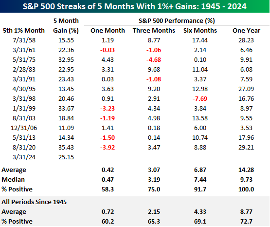 There have been 12 prior instances of 5-month streaks with 1%+ gains since 1945 and the future performance after these accomplishments have been impressive. As the first table illustrates, one month after the streak, the average return of 0.42% are lower than the all-periods average of 0.72%. However, things turn more positive when we look to longer terms. Three months after the streak, the average return was 3.07% with positive returns 75% of the time, far exceeding the all-periods average of 2.15% with positive returns 65.3% of the time. Moving even further out, six months after the streak, the return averaged 6.87% with a positivity rate of 91.7% again compared to all-periods averaging a return of 4.33% and positivity rate at 69.1%. Finally, and most impressively, we can see one year after the streak, the average return was 14.28% with positive returns 100% of time compared to the all-periods average of 8.77% and just a 72.7% positivity rate.