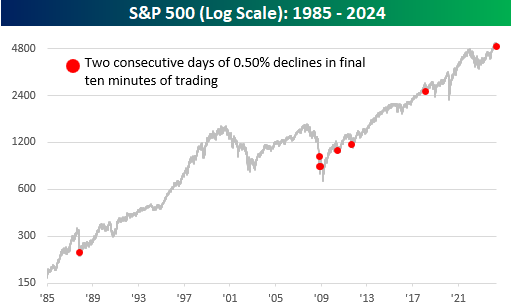 Shifting perspectives, the S&P 500 recently experienced back-to-back daily occurrences of the index declining 0.50% or more in the final ten minutes of trading this week, which has only happened nine times since 1985. As we can see in the next chart, most of these back-to-back declines came late in a market pullback. When looking at the performance of the S&P 500 following these rare instances, the results are mixed in the short-term, but consistently strong six- and twelve-months later, average gains of 8.1% and 21.4%, respectively. Perhaps most impressive is that one year later, the S&P 500 was higher all nine times. The last table below highlights this data.