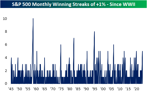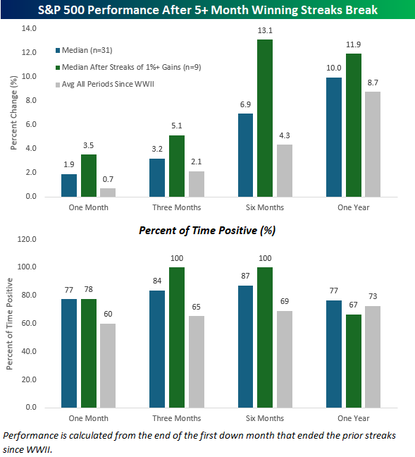 The first chart highlights the S&P 500 monthly winning streaks of +1% dating back to WWII. The current streak just ended at five months. While longer winning streaks have been relatively uncommon, the data shows that market conditions don’t necessarily turn bearish when they end. In fact, the median returns for the S&P 500 in the one-, three-, six-, and twelve-months following the end of prior five-month winning streaks of 1%+ gains have been better than the average for all periods. Additionally, the S&P 500 was higher 100% of the time in the three- and six-months after the prior streaks ended, with median gains of 5.1% and 13.1%, respectively. The second chart illustrates the performance of the S&P 500 after a five-month or more winning streak break as well as providing positivity rates for one-, three-, six-, and twelve-month periods.