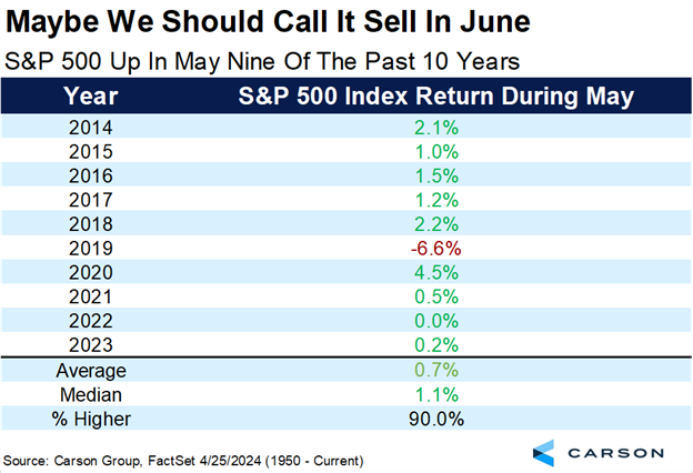 However, this pattern has not held true in recent years. In fact, the S&P 500 has gained in eight of the last ten years (80% positive rate) from May to October with an average return of 4.0%. In fact, the month of May alone has performed quite well over the past ten years, posting positive returns in nine of the past ten years averaging 0.7%. The next two charts illustrate these data points with the performance of the S&P 500, focusing on returns from May to October in the first chart, and just the month of May in the second.