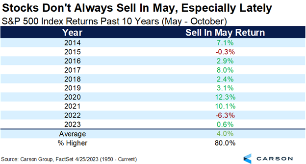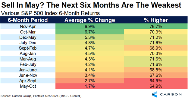 The "Sell in May and go away" investment axiom suggests that the six-month period from May to October has historically been the weakest period for the stock market. The first chart highlights the performance of the S&P 500 Index over different 6-month increments since 1950. As we can see, November through April has indeed been the strongest performing period with returns averaging 6.9% and positive returns occurring 76.7% of the time. In contrast, May to October has historically been the weakest, averaging returns of 1.7% and positive returns occurring 64.9% of the time. While this axiom has proved to be correct in a general sense, it is only looking at one specific point in time from start to finish. There are periods of time, depending on the start date, during the weaker months that have strong returns. It can also depend on individual companies and sectors which may have different seasonal patterns. In addition, this is on average, and does not account for the fact that returns are generally still positive over the weaker periods.