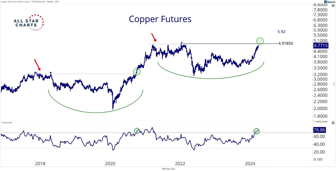 The price of copper futures broke out this week hitting an intra-day all-time high on Wednesday before closing just shy of the all-time high. Due to copper's widespread applications in most sectors of the economy - from homes and factories to electronics and power generation and transmission - demand for copper is often viewed as a reliable leading indicator of broad economic health. This demand is reflected in the market price of copper. The following chart highlights the price for copper futures this week compared to 2022 and provides a future potential technical price target of $5.92.