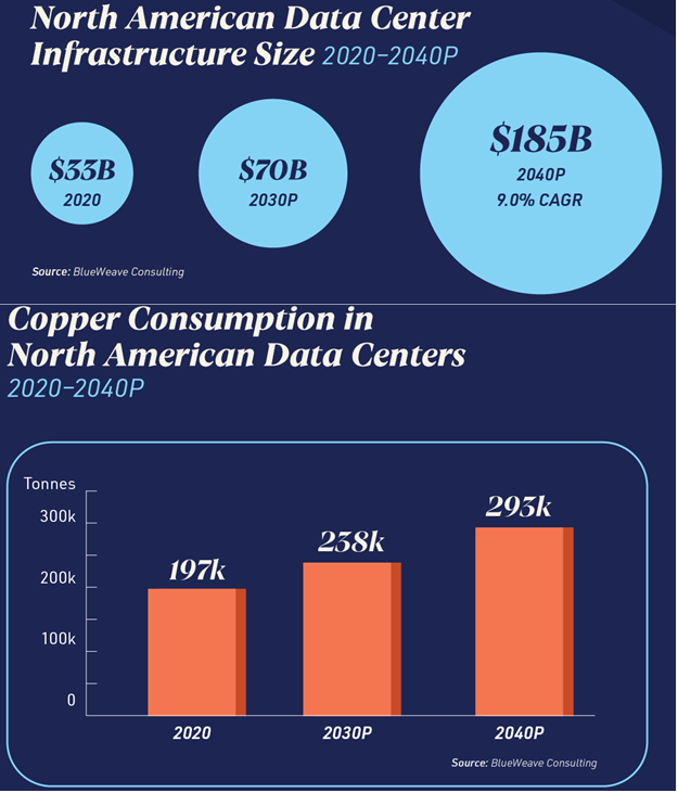 As we discussed, copper plays a vital role in critical infrastructure, and this role is expanding today as we move to a more ‘green’ and electrified society. The first chart below illustrates the growth of copper demand starting from 2021 with projected numbers through 2040. The annual demand is estimated to increase by 53% between 2021 and 2040. Another key factor, as we look to the reason for the recent spike in demand for copper, and a potential driver behind it is data centers. Data centers are computer server hubs that collect, store, and process enormous amounts of data, and require an extensive infrastructure network and power supply. With the rise in artificial intelligence (AI), more data centers will be needed to facilitate the power needed for these applications. The second chart breaks down the copper content by application in data centers. Finally, the last chart below highlights the expected North American data center infrastructure size by investment from 2020 to 2040, as well as the projected copper consumption for these data centers. As we can see, investment is expected to grow by over 460%.