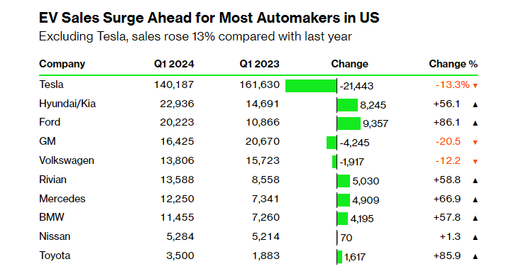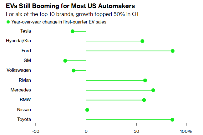 The U.S. has seen a significant slowdown in electric vehicle (EV) sales; however, data may suggest this is more of a temporary blip rather than a long-term trend. This slowdown has led to Ford dramatically scaling back expansion plans and Tesla laying off 10% of its global workforce. Despite flat sales in the first quarter of 2024, several automakers like Hyundai-Kia, Ford, and BMW saw significant year-over-year growth, indicating a tale of two EV markets where consumers are favoring models with superior battery range, faster charging, and competitive pricing. The two charts below highlight the EV sales growth for the top 10 brands selling EVs in the U.S. It is important to note that if you exclude Tesla’s sales numbers, U.S. EV sales grew 13% over last year.