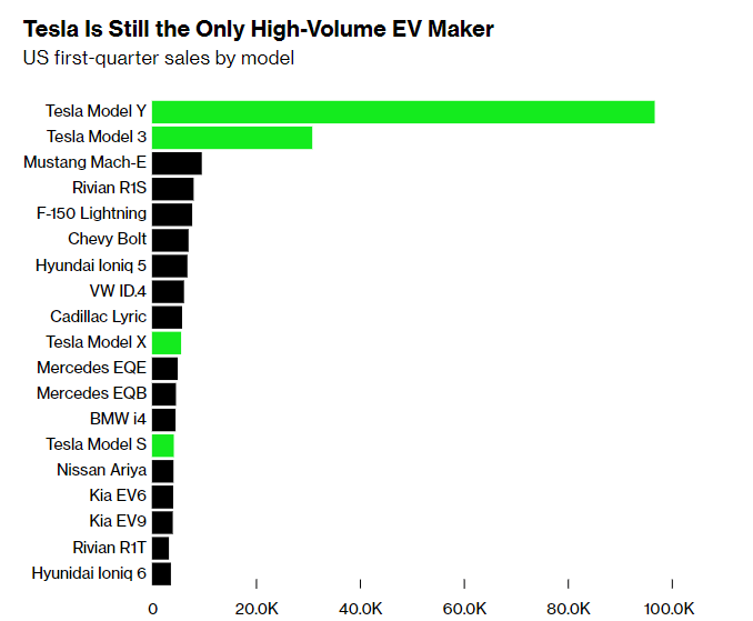 Despite the temporary slowdown, long-term forecasts for U.S EV sales remain optimistic. The International Energy Agency (IEA) estimates fully electric vehicle sales will soar to 2.5 million in 2025, up from 1.1 million in 2023. The first chart below illustrates this estimated production growth. Other automakers like Hyundai, Ford, and Stellantis (EV Jeep and Ram manufacturer) are aggressively introducing affordable EV models to build economies of scale and compete with Tesla's dominance. Experts stress automakers should not overreact to Tesla's stumbles and instead focus on mass EV production to gain market share. It is also important to note that Tesla is still the only high-volume EV maker in the U.S. that has been able to sell more than 100,000 EVs per year across its EV lineup, but this year, Hyundai, GM, and Ford are each on track to reach that 100,000 threshold, adding much needed U.S. EV competition. The second chart highlights U.S. first-quarter sales by model.