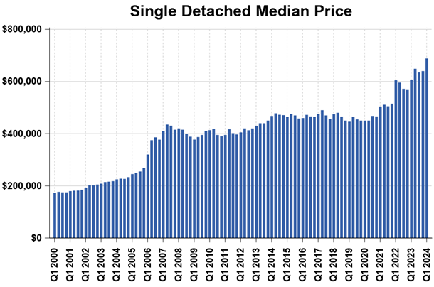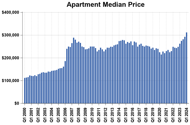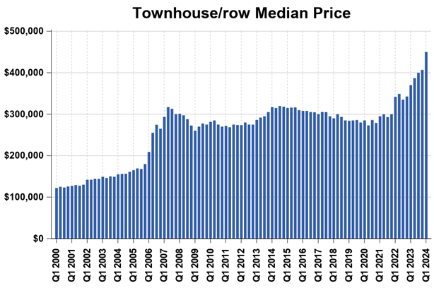 In Alberta, and especially here in Calgary, we have seen a very strong housing market over the last three years, reaching all-time price highs in 2024, driven primarily by the rise in population over recent years. As the first chart illustrates, the median price for single detached homes in Calgary reached $688,500 in Q1 2024, marking a year-over-year increase of 13.4%. This trend extends out to townhouses as shown in the second chart below, with the median pricing hitting $450,000 and rising 21.6% year-over-year. Finally, the median price for apartment units reached $312,250 in the first quarter of 2024 as shown in the last chart, marking an impressive year-over-year increase of 19%.
