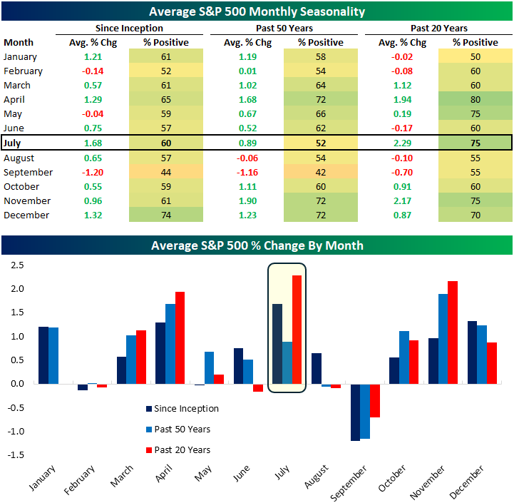 As the next chart illustrates, July has historically been a very strong performing month for the S&P 500, with the month being the top performer of all months since inception and for the last 20 years, averaging returns of 1.68% and 2.29% with positive returns occurring 60% and 75% of the time, respectively. This strength also extends to the blue-chip Dow Jones Industrial Average, where it has also been the strongest month of the year since inception, and the second strongest over the past 20 years with an impressive 80% positive return rate. It is also important to note that global market performance in July tends to follow similar patterns to the U.S. market during this period.