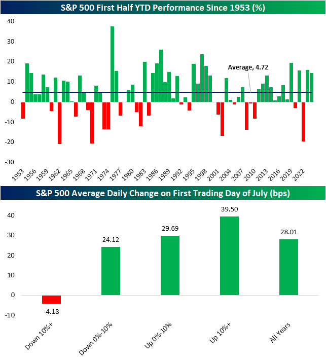 The first chart below shows that this year’s YTD return for the S&P 500 is closely in line with 2023 and 2021, and far outpacing the average since 1953 (represented by the blue line) of 4.72%. Looking forward to July, this year’s YTD return of over 10% offers reason for optimism to kick off the month, as stronger YTD numbers tend to provide favourable returns on the first trading day of July. As we can see in the second chart below, since 1953, when the S&P 500 experiences 10%+ returns for the first half of the year, the average daily change on the first day of trading in July is 39.50 bps which far outpaces the all-years average of 28.01 bps.