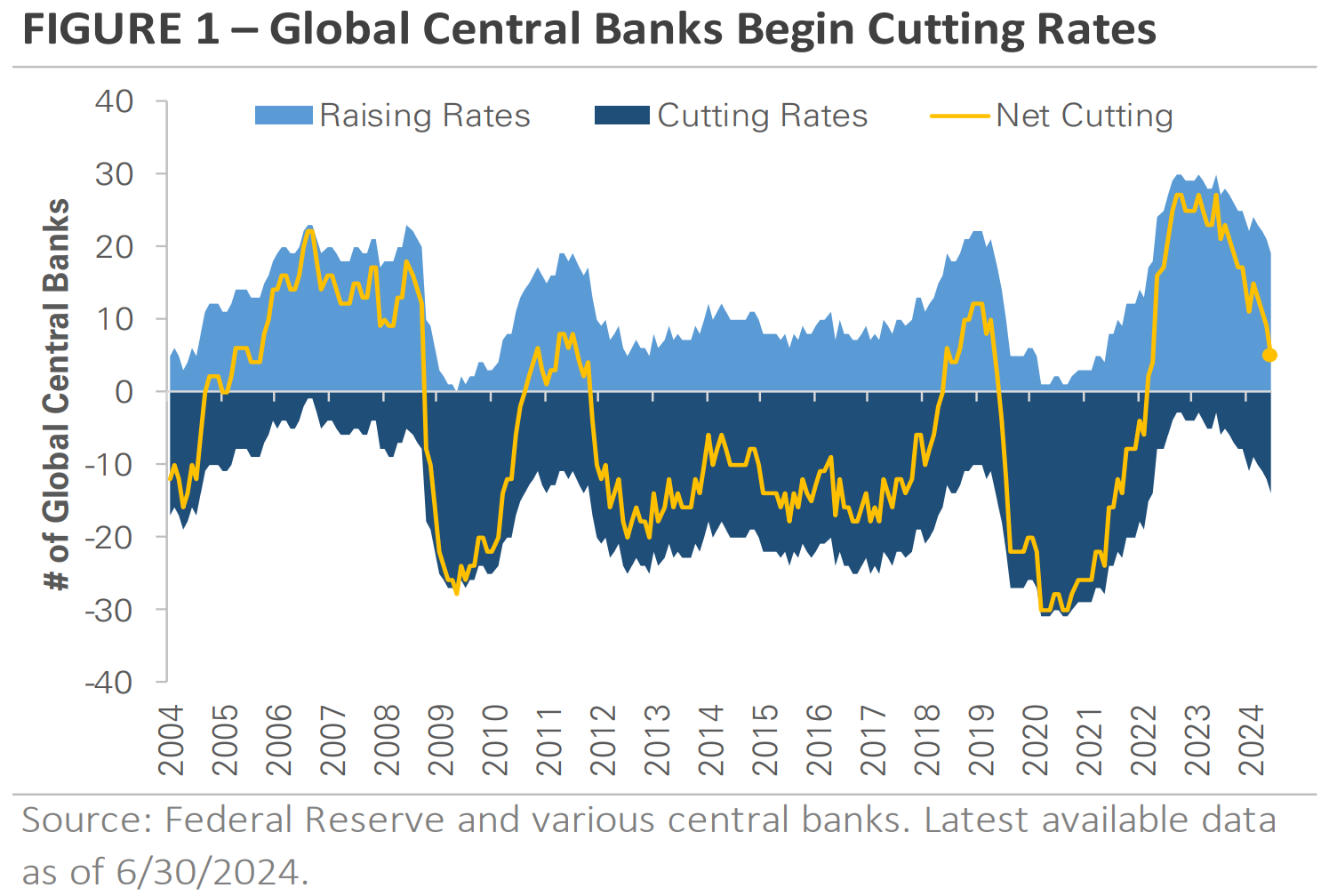 While the Fed waits for more confirmation that U.S. inflation will return to target, the trend among global central banks has shifted decisively away from tightening. Figure 1 categorizes over 30 of the largest central banks based on whether their last policy action was a rate hike or a rate cut. The line shows the net number of central banks tightening versus easing. When the line is positive, it indicates more banks are raising interest rates. When it’s negative, it indicates more banks are cutting interest rates.