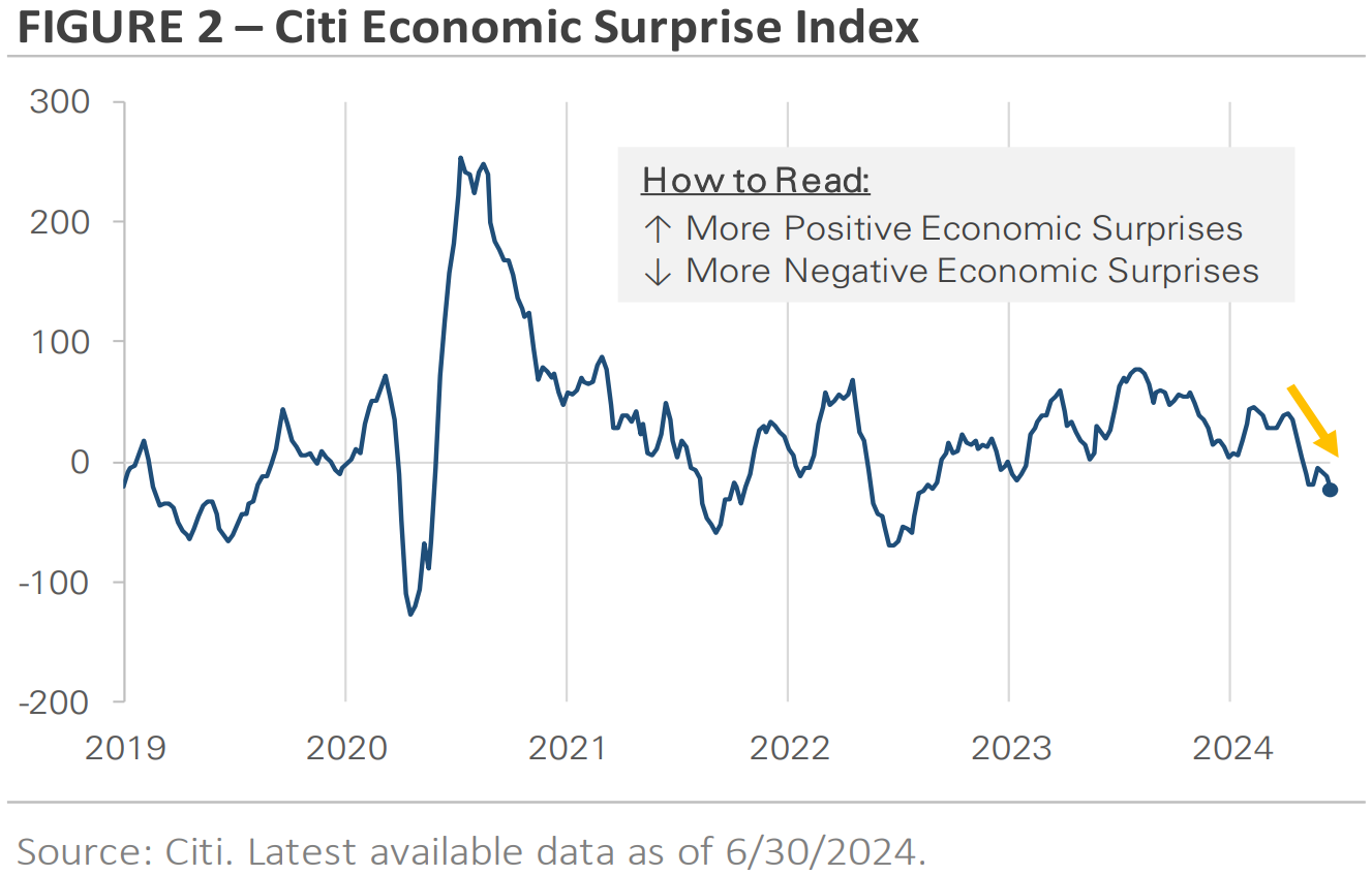In Q2, there was an increase in the number of negative economic surprises as the U.S. economy underperformed expectations. Job growth slowed in April, and the unemployment rate rose to 4% in May from a 70-year low of 3.4% in April 2023. Keep in mind that 4% is still a low rate, historically. Retail sales declined in April, raising concerns about the U.S. consumer's strength and potential stress for lower-income households. May manufacturing survey data signaled a slowdown, and the U.S. Census Bureau reported that the economy grew more slowly in the first quarter than initially estimated.