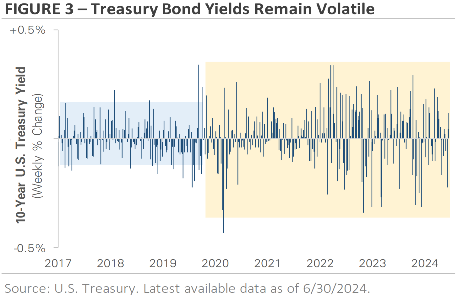 Bond yield movements show the data’s volatility and the market's indecisiveness. Figure 3 graphs the weekly changes in the 10-year Treasury bond yield over the past eight years. From 2016 to 2020, the 10-year yield’s movements were relatively small. The large drops near the middle of the chart mark the onset of the COVID pandemic and the Fed’s decision to slash interest rates to near zero. The right side of the chart shows that yields have been more volatile in both directions since the Fed began raising interest rates in March 2022. Today, Treasury yields are the most volatile they have been in eight years as the market navigates a complex transition from rate hikes to rate cuts.