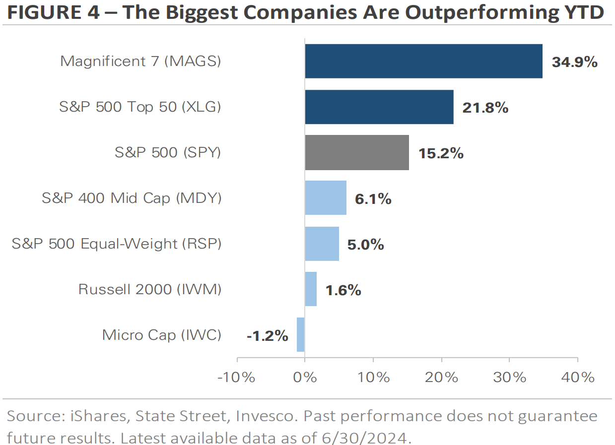 One notable theme in the stock market this year has been the outperformance of the largest companies (all Tech). The S&P 500 Index increased +4.4% total return in Q2, increasing its 2024 return to more than +15%. In contrast, the Russell 2000 Index of small cap companies fell by -3.3%, lowering its 2024 total return to +1.6%. Figure 4 shows that this gap between large and small stocks is evident across equity indices, regardless of market cap. It graphs the year-to-date price returns of seven ETFs with varying exposures to companies of all sizes.