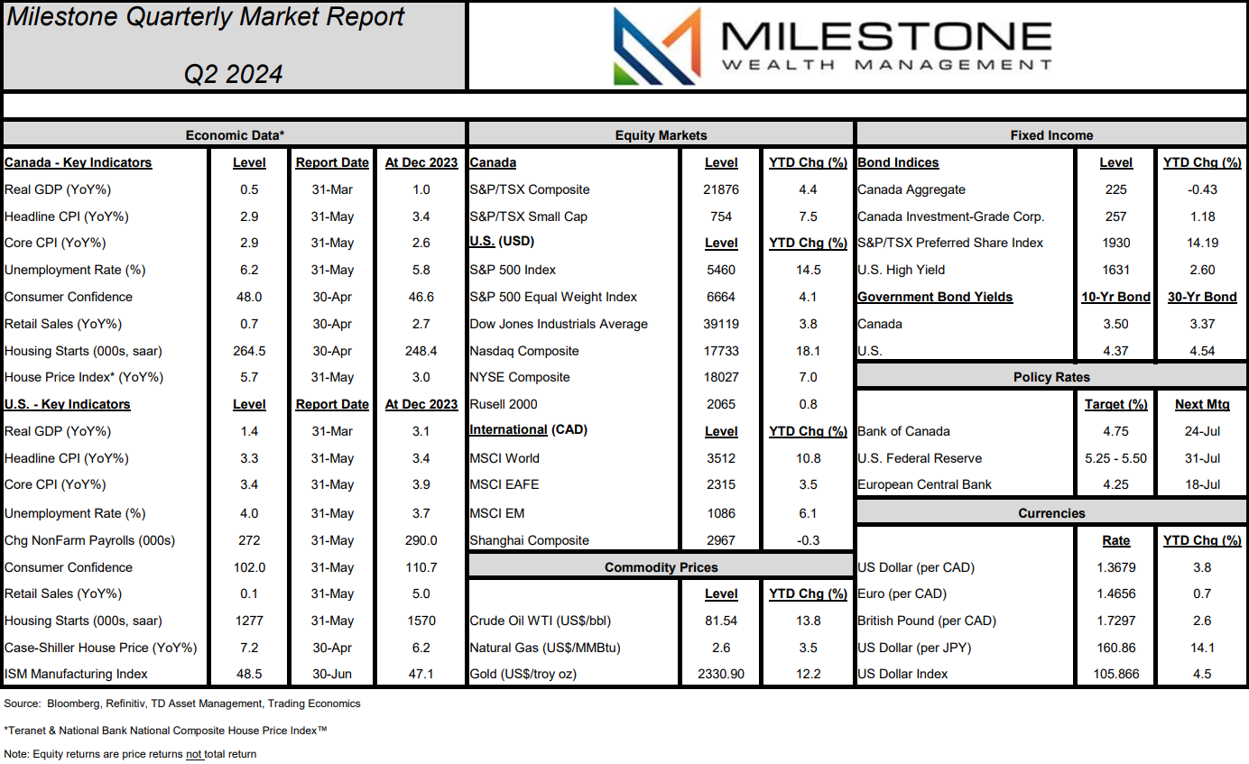 Here is our quarterly Market Report on economic data, capital markets, commodities, and currencies through June 28th, 2024: