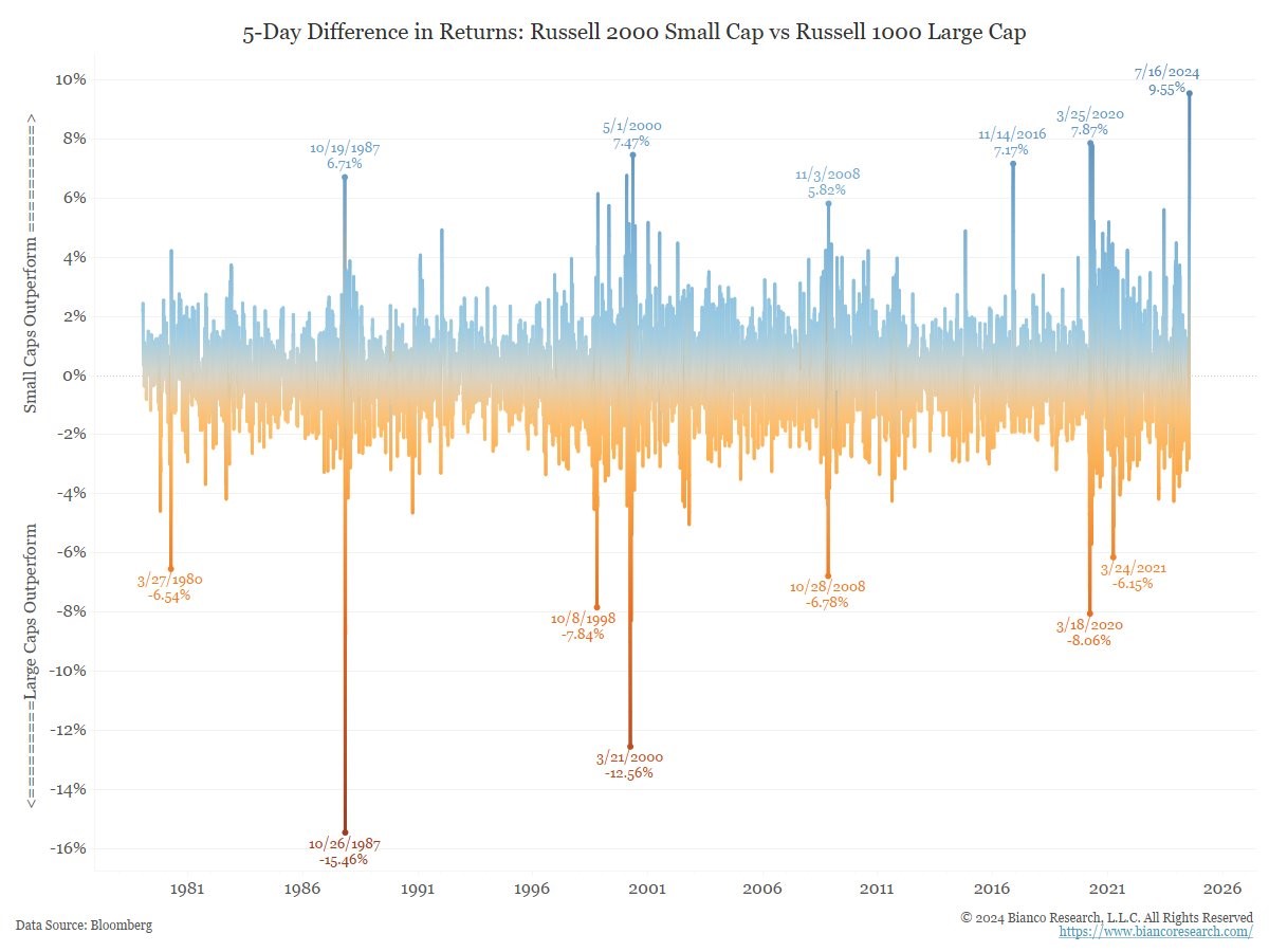 In addition to this, July 16th marked the largest 5-day difference in returns between the Russell 2000 Small Cap Index and the Russell 1000 Large Cap Index in history, coming in at 9.55%. The table below shows this new record as well as previous records dating back to 1978. This in combination with the above, could quite easily be labelled as the most unprecedented upward relative movement of small cap stocks vs. large cap stocks that we have ever seen over the span of a few days. Only time will tell if this is meaningful or not.