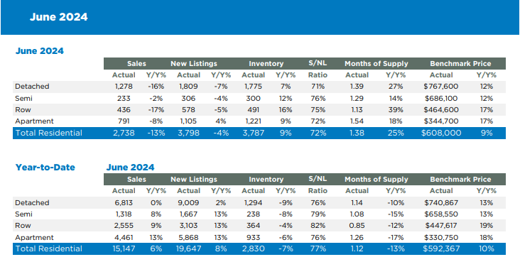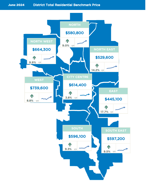 This tight supply, especially in lower price ranges, has driven further price increases across all property types and districts. The next image illustrates the benchmark price for all residential properties rose to $608,000 in June, marking an 8.5% increase year-over-year overall. apartment pricing saw the largest increase of 17.5%, followed by row pricing at 16.9%, then semi-detached and detached housing rising by 12.2% and 12.0% over the last year. Notably, the Northeast and East districts experienced the most significant year-over-year price gains as shown in the District Residential Total Benchmark Price map below.