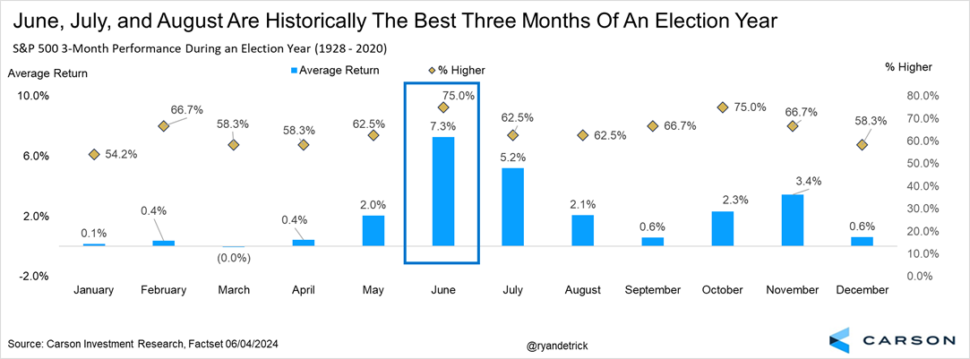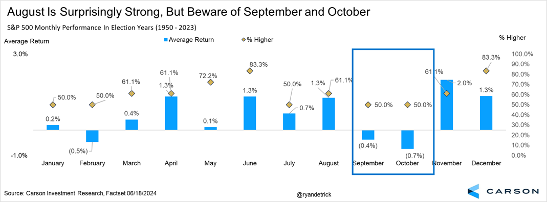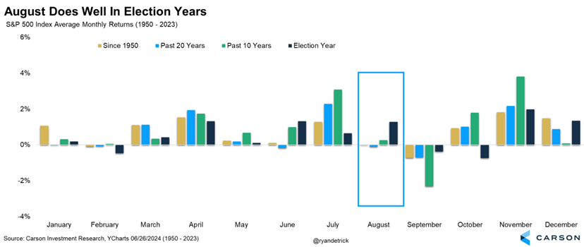 Despite the generally positive outlook for August in election years, investors should be prepared for potential market corrections in September and October. As the last chart shows, during the period of 1950-2023 for elections years, September and October have posted average returns of -0.4% and -0.7% with positive returns for both months occurring just 50% of the time. It is important to note, however, that there has typically been a post-election bounce for stocks with November and December posting average returns of 2.0% and 1.2% and posting positive returns 61.1% and 83.3% of the time, respectively.