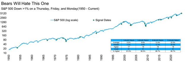 Finally, on an interesting note, the 1% or more drawdown that was observed in the S&P 500 on Thursday the 1st, Friday the 2nd, and Monday the 5th, has provided positive outlook in past instances. As we can see in the chart below, since 1950, when there has been a drawdown of more than 1% on a Thursday, Friday, and Monday, the returns 1-month out have averaged 5.0% with positive returns occurring 81% of the time, returns 3-months out averaged 9.8% with positive returns occurring 90.5% of the time, returns 6-months out averaged 13.4% with positive returns occurring 85.7% of the time, and returns 12-months out averaging 22.5% with positive returns also occurring 85.7% of the time. Time will tell if this year follows a similar path.
