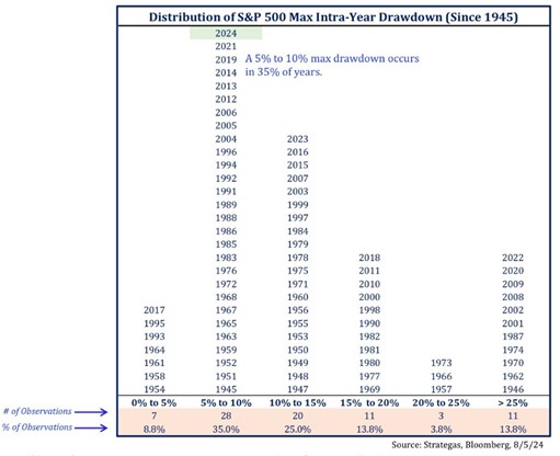 It is important to note that drawdowns are not uncommon for the S&P 500; however, the severity of the drawdown can be. As we can see in the chart below, the most recent intra-year drawdown of the S&P 500 of 8.49% from its peak on July 16th to trough on August 5th, was the 28th such occurrence since 1945 of a 5%-10% max drawdown, and the most common drawdown occurrence with 35% of total observations. Interestingly, more mild max drawdowns of 0%-5% are much rarer, occurring just seven times since 1945 and just 8.8% of total occurrences.