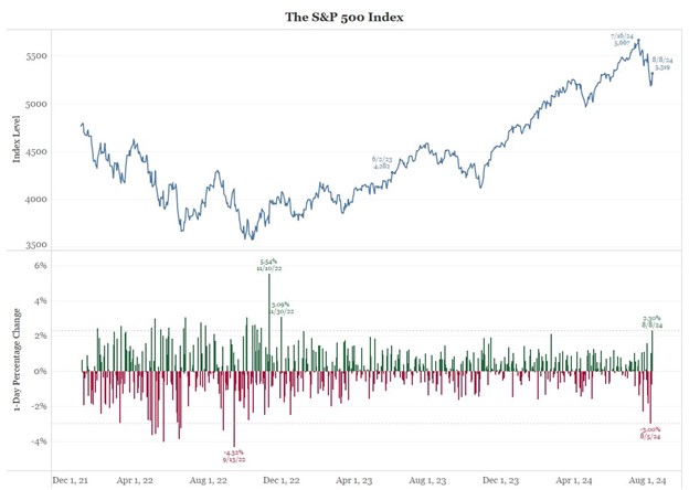 The chart below highlights this recent volatility, showing the performance of the S&P 500, going back to 2022 while also demonstrating 1-Day Percentage Changes in the index. As we can see in the bottom half of the chart, the 3.00% decline of the index on August 5th marked the second worst single day decline since September 13th, 2022, where the index fell 4.32%. This same week, we saw the index return 2.30% on Thursday, August 8th, marking the third highest single day gain since November 10th, 2022.