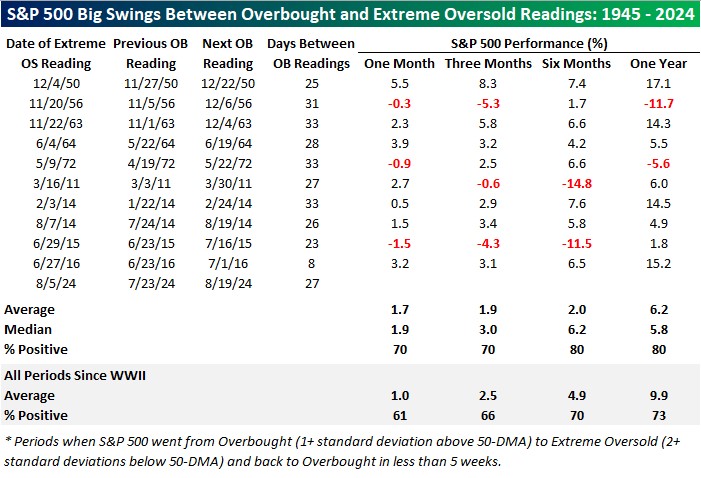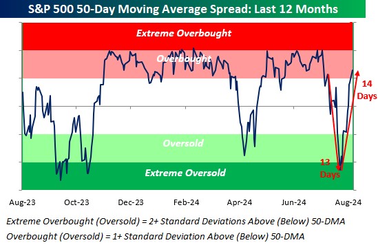The recent performance of the S&P 500 has shown significant volatility, with the index experiencing an eight-day rally that has pushed it back into overbought territory for the first time since late July. This movement is illustrated in the chart below, demonstrating the S&P 500's 50-day moving average (DMA) spread, which is measured in standard deviations. The chart indicates that extreme overbought conditions occur when the index closes two or more standard deviations above its 50-DMA. This pattern of rapid shifts between overbought and oversold conditions is noteworthy, as the index has transitioned from extreme oversold to overbought levels in a remarkably short span, taking only 14 days to rebound from its last extreme oversold reading on July 23.