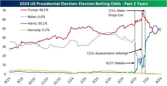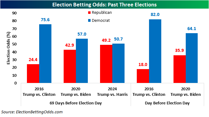 Current betting odds for the 2024 election show a tight race between Vice President Harris and former President Trump, with Harris holding a slight edge as we can see in the first chart below. However, it's worth remembering that betting markets have not always been reliable predictors of election outcomes, as shown in the second chart below. Markets were very confident in Clinton beating Trump in 2016 and we remember how that played out.