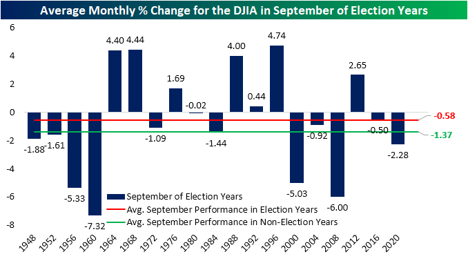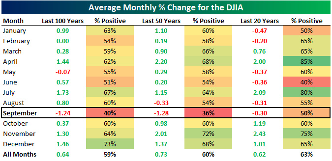 As we bid farewell to August, investors are bracing themselves for what has historically been the most challenging month for the stock market: September. Over the past century, the Dow Jones Industrial Average (DJIA) has averaged a decline of 1.24% during this month, making it the only month with negative returns more than half the time. As we can see in the chart below, this trend continues when observing the past 50 years, posting returns of -1.28% with positive returns a little more than a third of the time, and the past 20 years, posting returns of -0.30% with positive returns just half the time. This year, however, brings an additional layer of complexity to the usual September slump. With the 2024 U.S. presidential election on the horizon, market watchers are keeping a close eye on how political factors might influence stock performance.