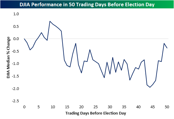 Interestingly, September's performance during election years has been slightly better than in non-election years, with an average decline of 0.58% compared to 1.37%, as shown in the first chart below. While this might offer a glimmer of hope, it's important to note that the overall trend remains negative. As we enter the crucial 50-day period leading up to Election Day, historical data suggests we might see a decline in the DJIA, followed by a potential uptick in the final week before the vote. This pattern is reflected in the second chart below, demonstrating the cautious sentiment that often pervades the market as political uncertainty looms.