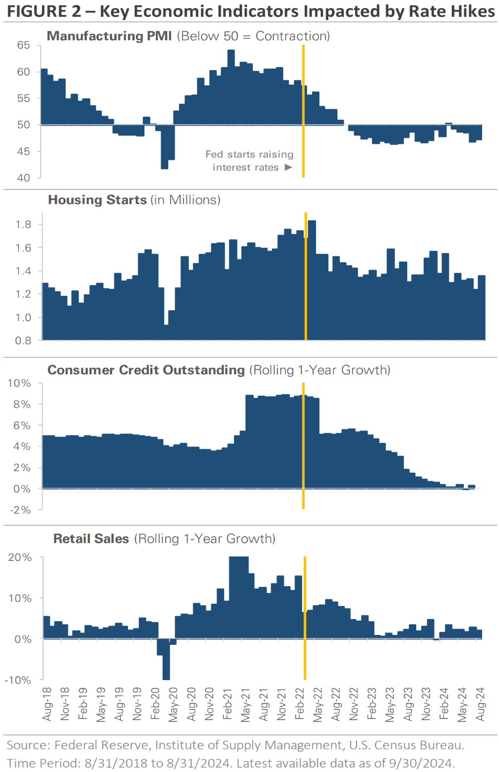 Figure 2 below graphs four economic indicators that offer insight into the current state of the U.S. economy: manufacturing PMI, housing starts, consumer credit, and retail sales. To show the impact of interest rate hikes, the start of the Fed’s tightening cycle in March 2022 is marked on each chart.