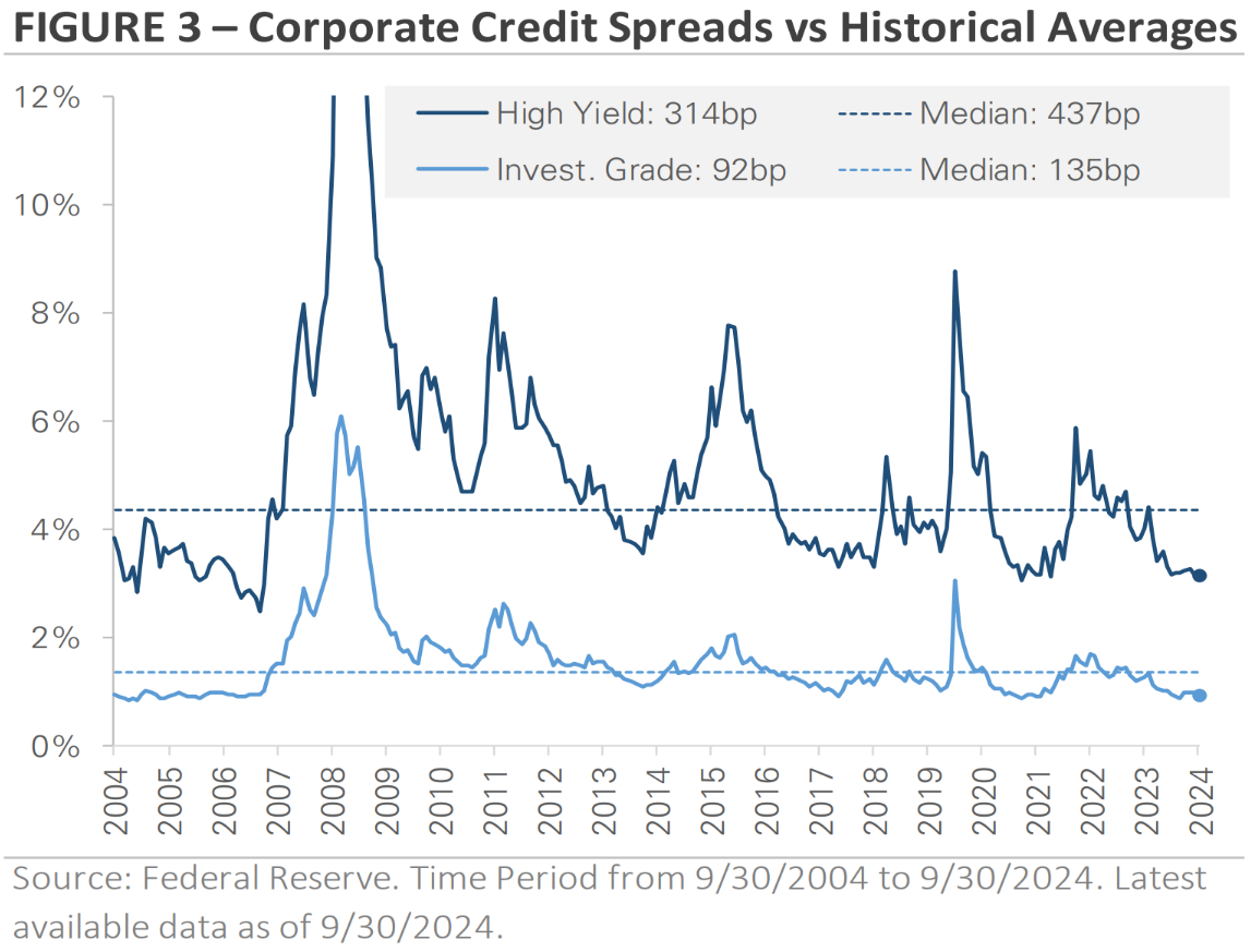 Credit spreads, which measure the difference in yield between two bonds of similar maturity but different credit quality, remain tight by historical standards and potentially indicate limited relative upside price opportunities. Figure 3 next graphs the credit spreads for U.S. corporate investment grade (IG) and high yield (HY) bonds over the past 20 years. The IG spread stands at 0.92%, meaning that investors are earning an extra +0.92% of yield by owning IG over similar Treasury bonds. Since 2004, the median IG spread has been 1.35%. The situation is similar for HY bonds, where the current spread is 3.14% compared to a median of 4.37%.